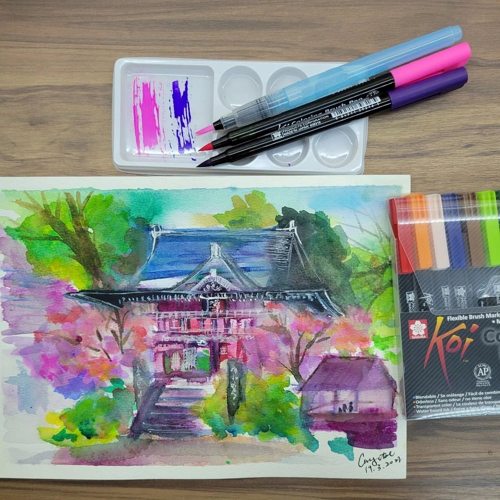 - It looks very nice using the Koi Coloring Brush Pen like watercolors. The vividness of the ink and the watercolor-like bleeding beautifully express traditional Japanese landscapes.