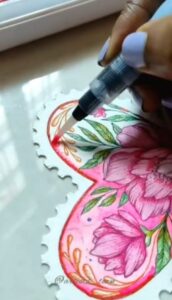 7.Adding Glitter: To give a magical effect to the flower, draw lines on the petals using a little bit of Pearl Red color (color#284) on the tip of the brush. Additionally, apply Light gold color (color#252) to the center of the flower.