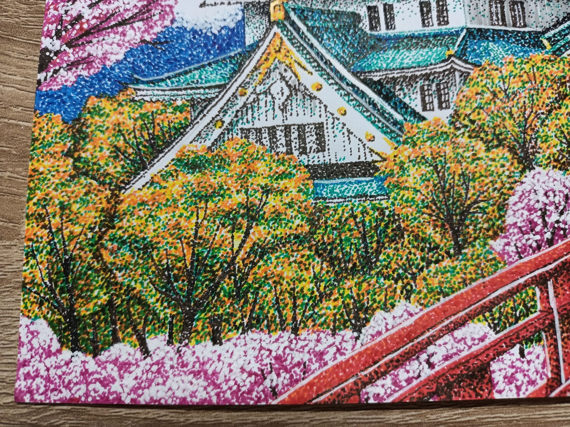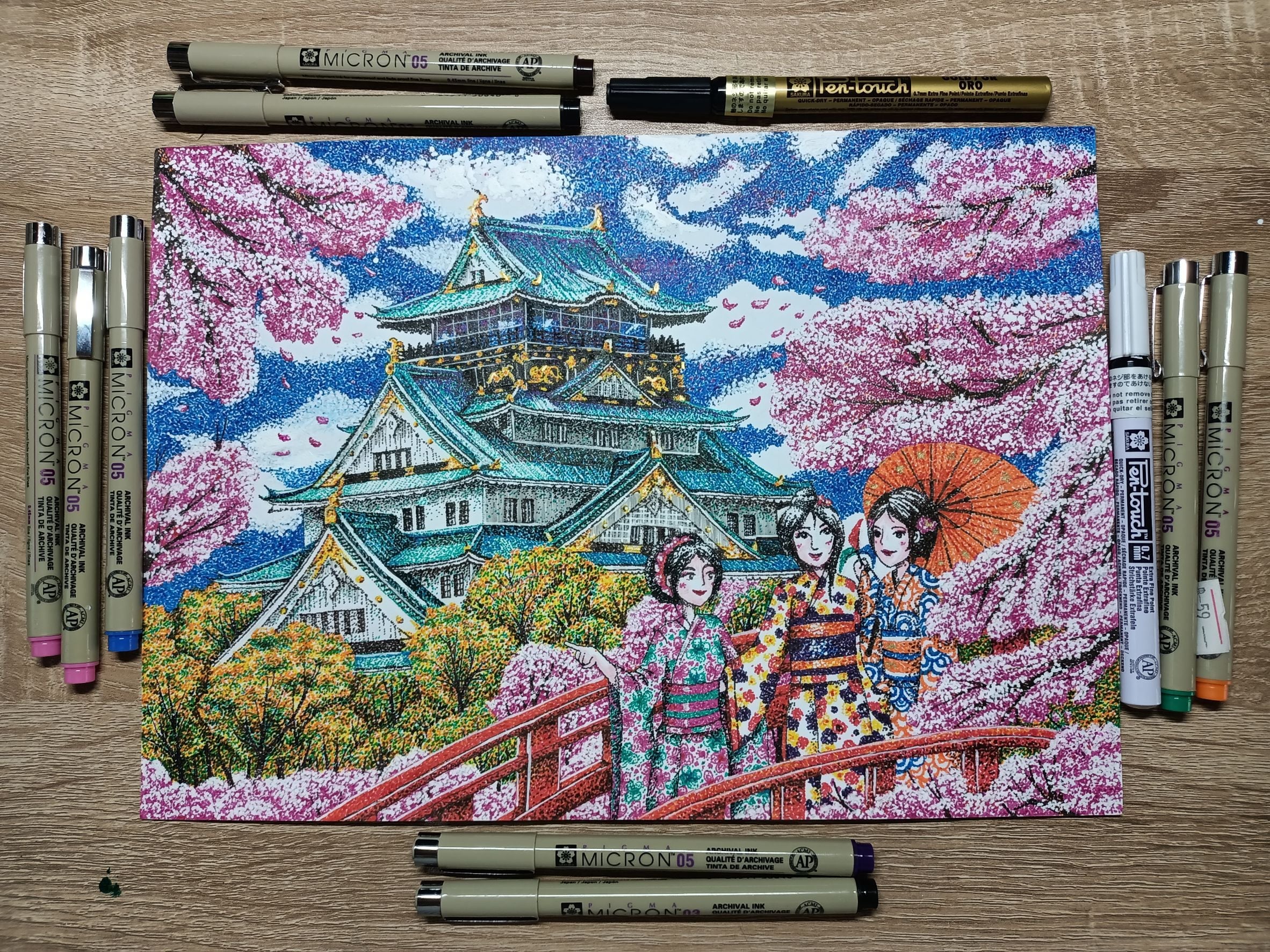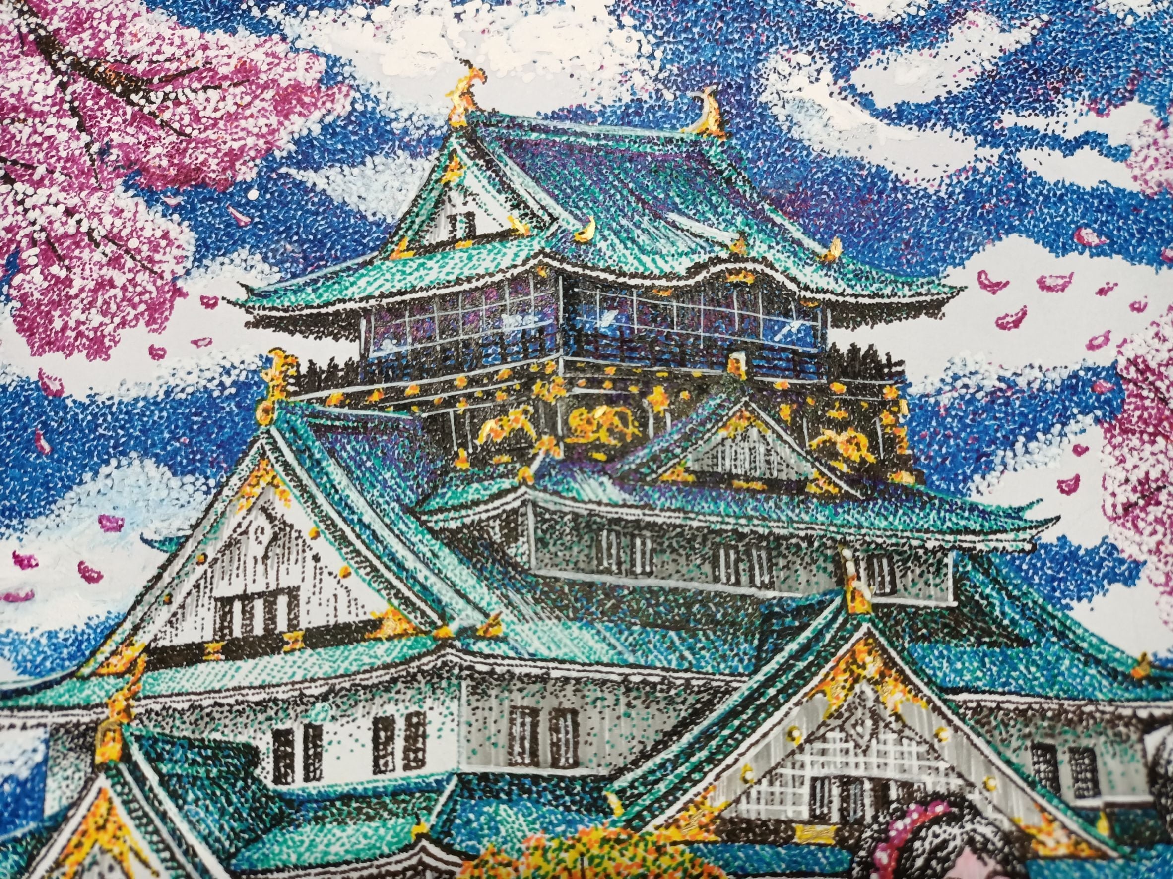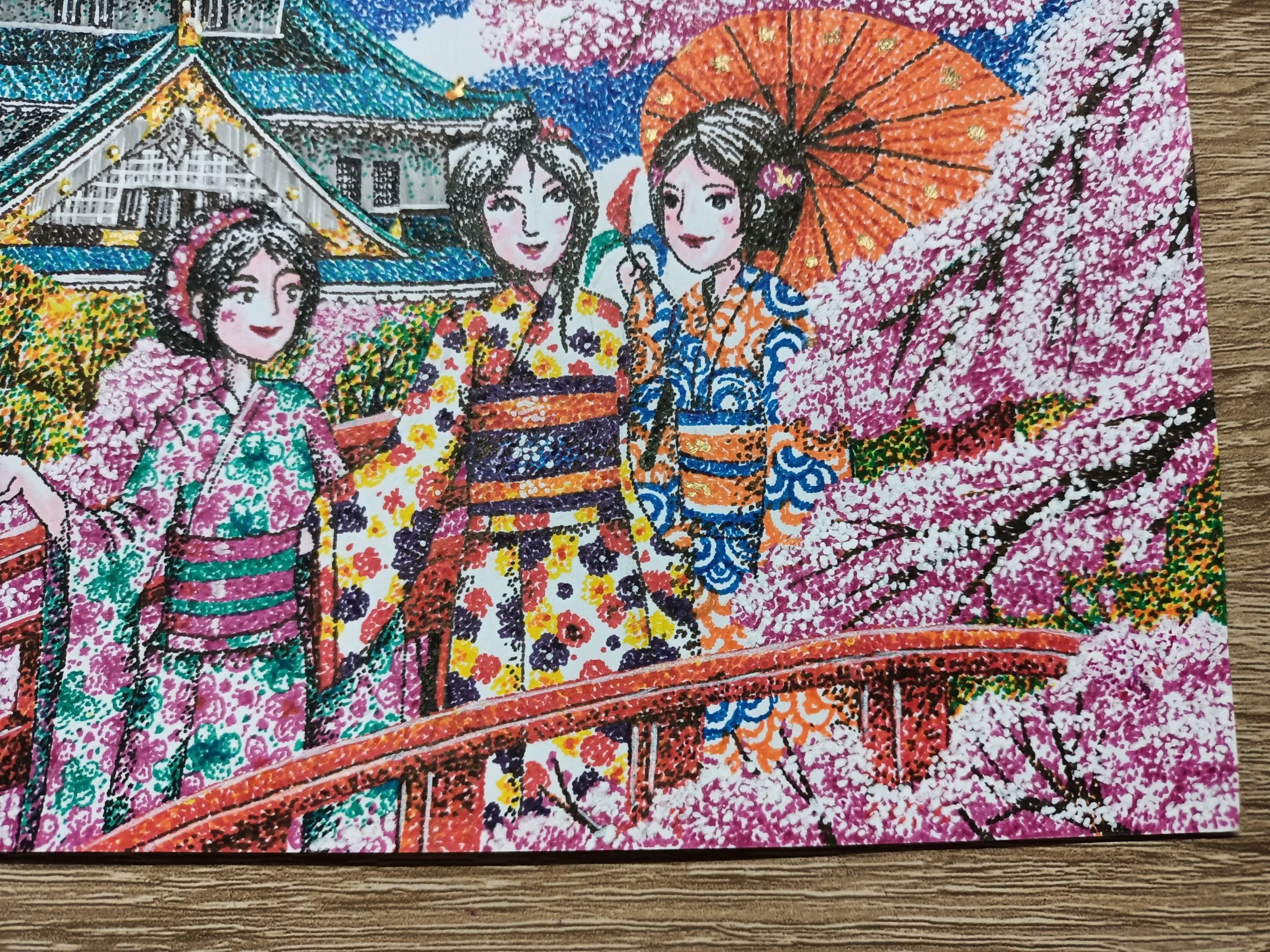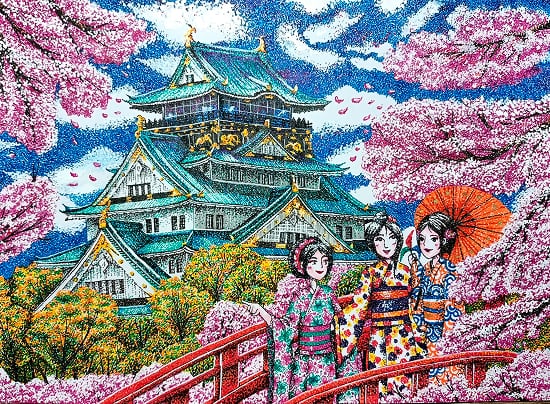 - This artwork used Pointillism and Aechtectural. This conveys that enjoy watching the Sakura Flower at Osaka Castle with friends and happy with wearing a Kimono. talkig with friends and enjoying the beautiful scenery. When ths Sakura Flowers bloom at the castle the scenery becomes more beautiful. So enjoying whtih watching Sakura Flowers, weariing a kimono and talking with friends can bring joy and hapiness.