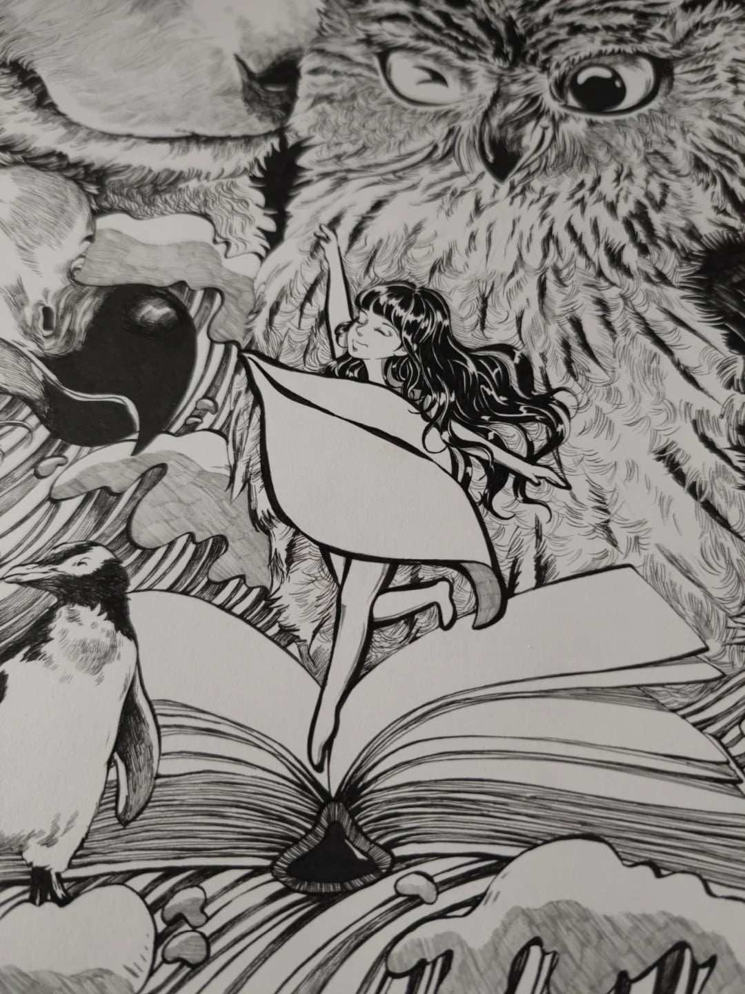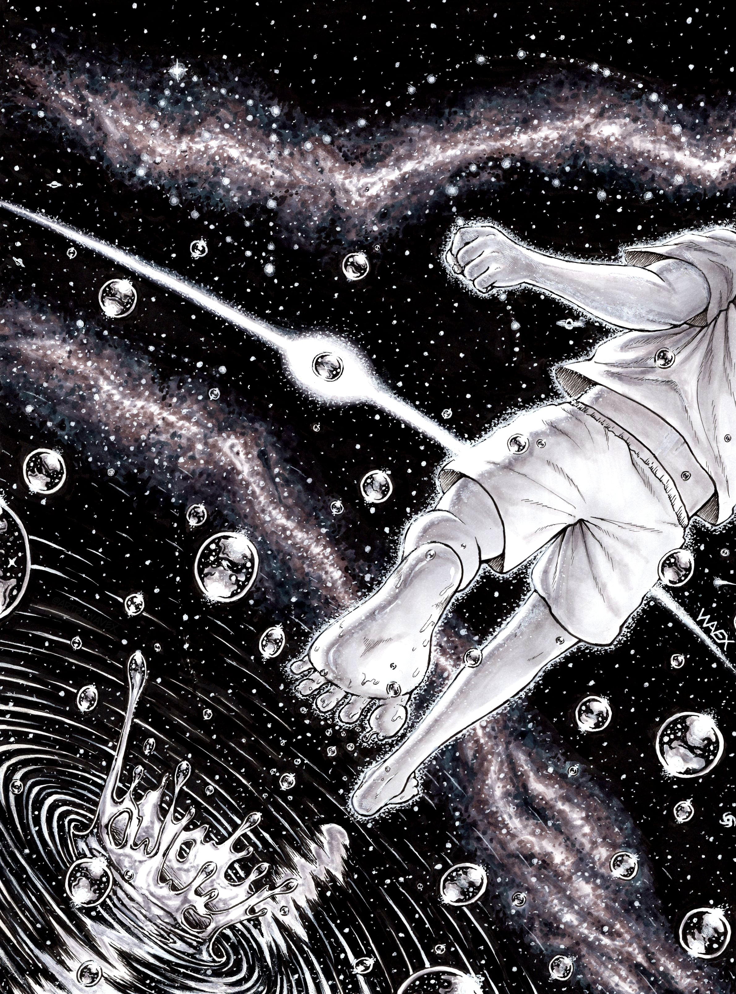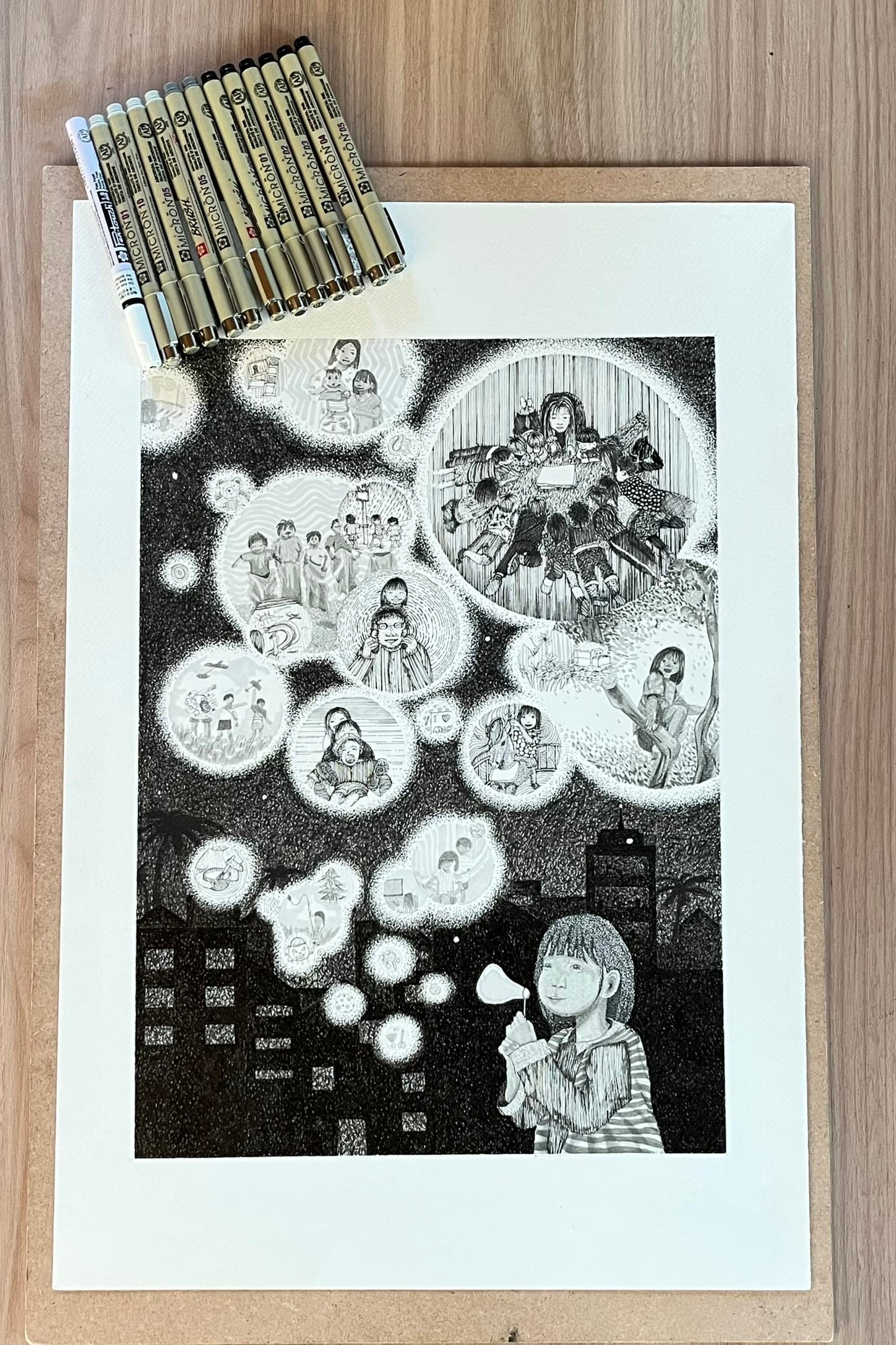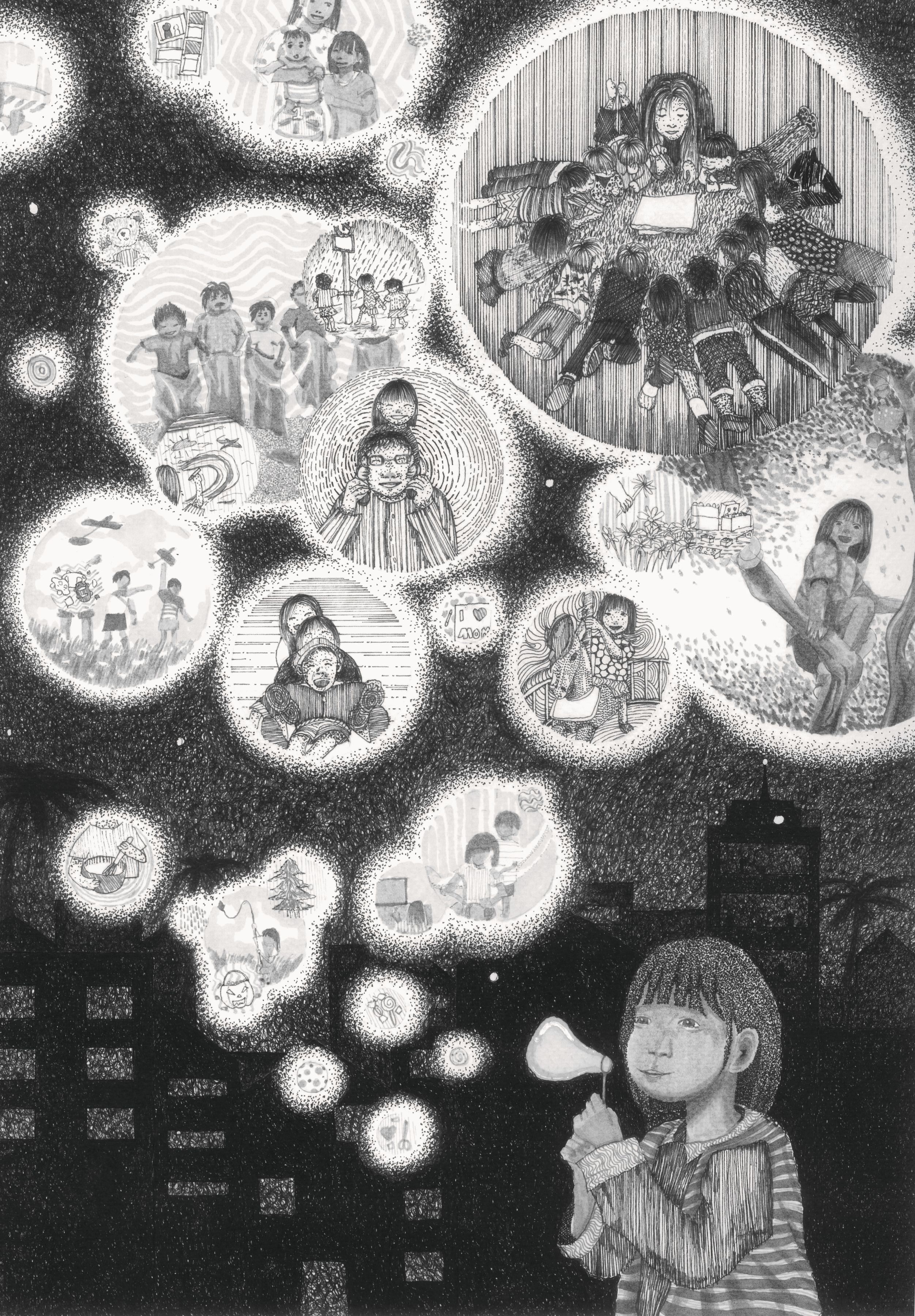 - The happiest moments in life often come from the carefree and magical days of childhood. During this time, happiness feels genuine and often arises from the simplest experiences. The city in the background symbolizes the present - a busy and ever-changing world, portrayed with darker tones to emphasize its contrast with the innocence of childhood. The deline technique, using intricate dots to create depth and shading, enhances this contrast and gives the piece a dreamlike quality. However, the child blowing bubbles serves as a reminder that the magic and joy of childhood still remain within us. The bubbles, with their lighter surroundings, are delicately detailed using softer dot density, symbolizing cherished memories that float through time. These memories bridge the past and the present, continuing to bring warmth, joy, and reflection to our lives.