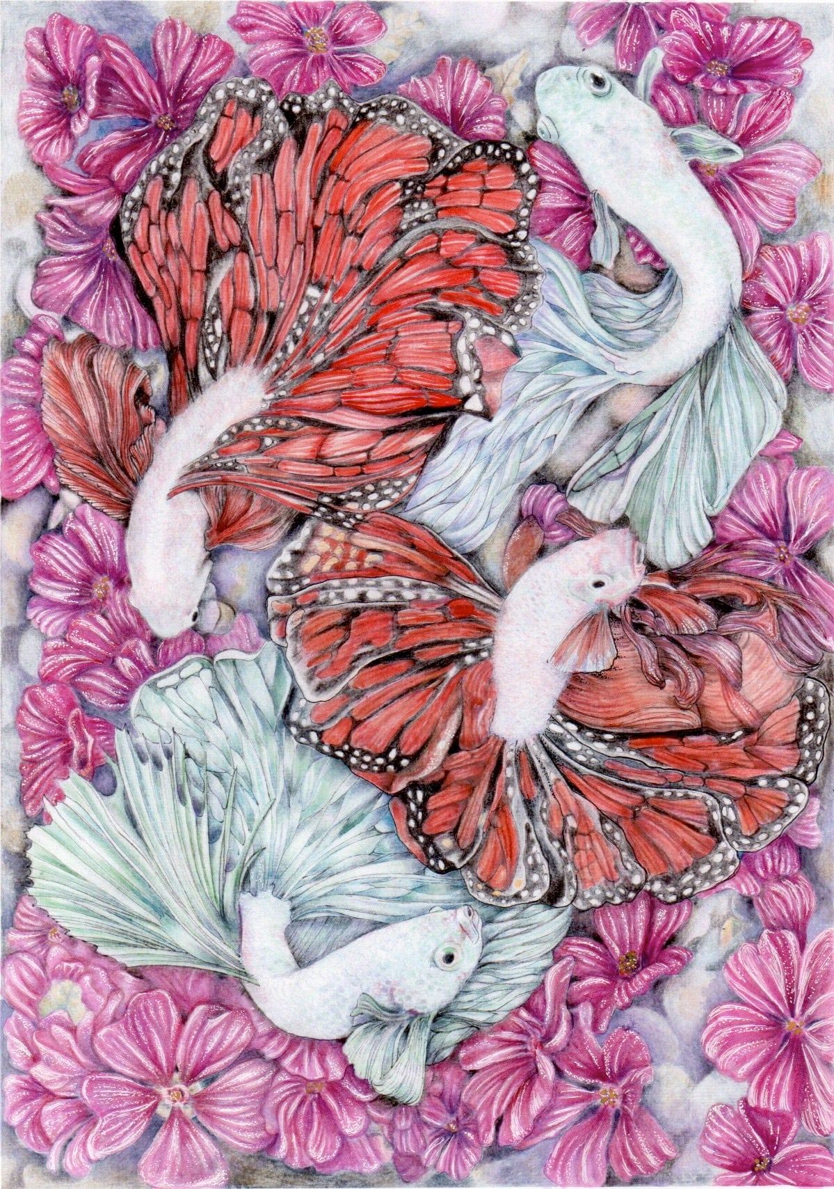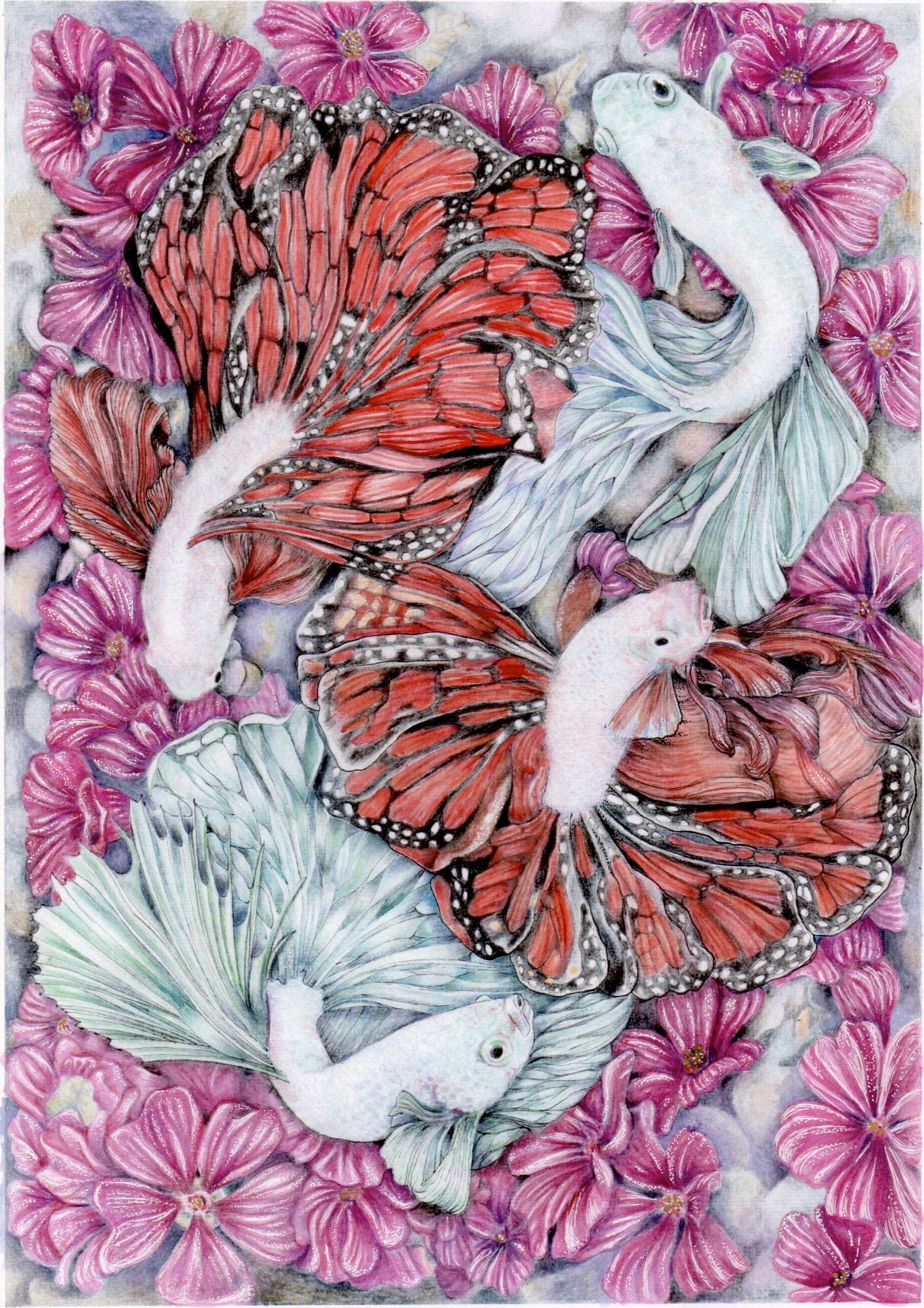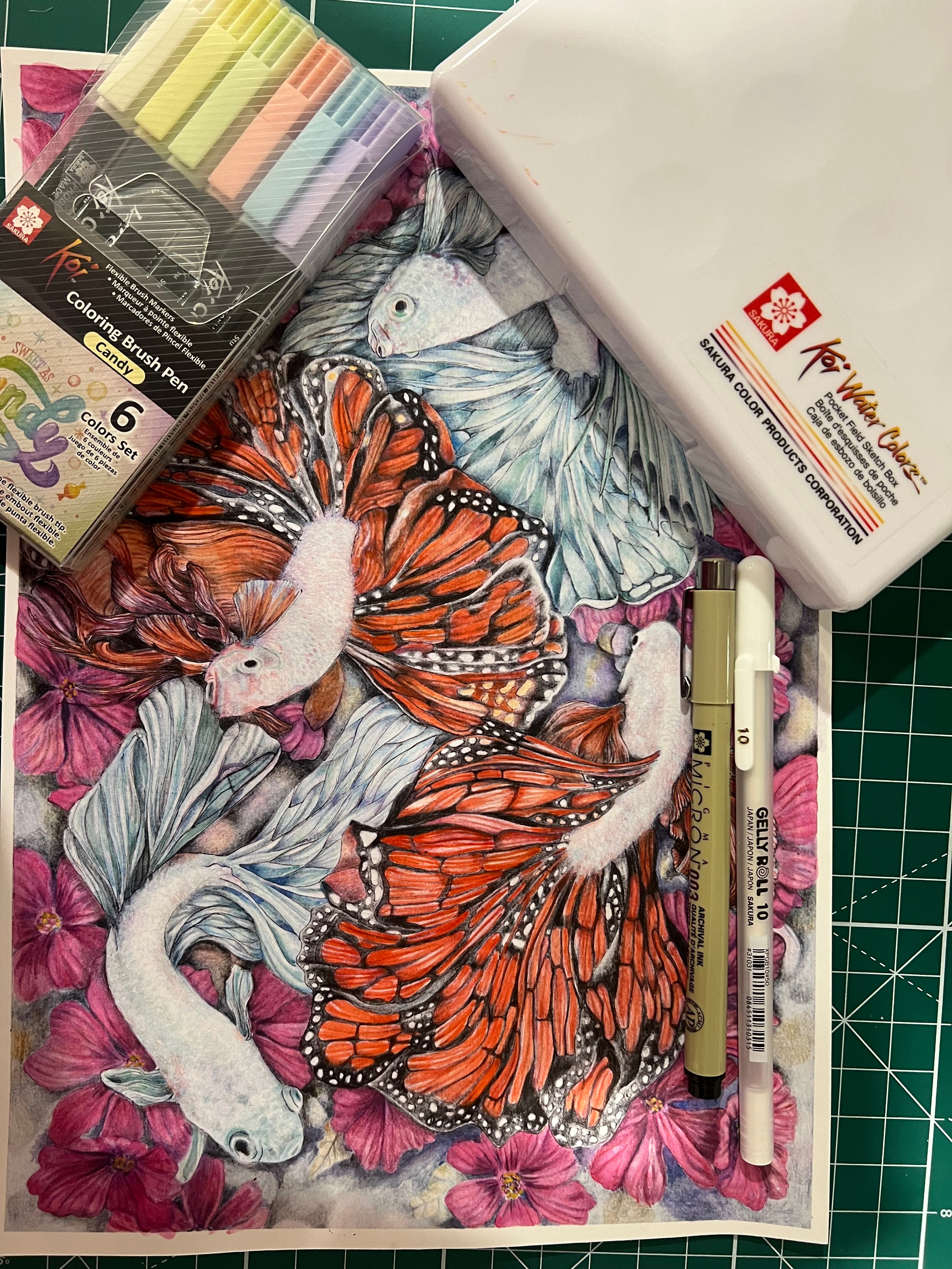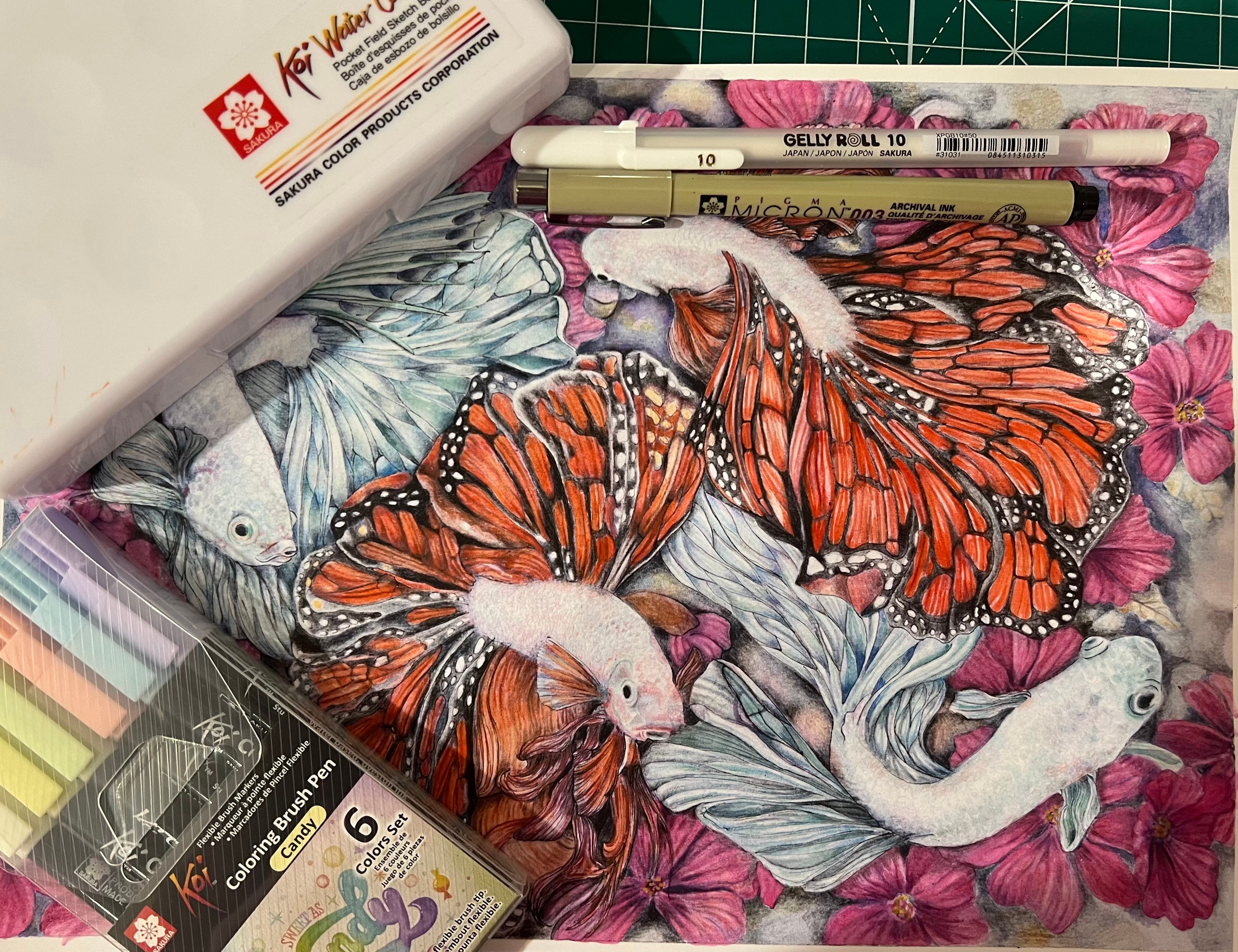 - The joy of unlimited imagination. In our dreams, fish can swim in a river of flowers and have butterfly wings. The image reflects the joy of freedom. My technique mixes several materials: Pigma Micron pens 003 and 005 were used to create the illustration. Then, for coloring, Water Colors Koi and Coloring Brush Pen Koi (Earth and CANdy) were used. For light effects, Gelly Roll 0.5 and 10.