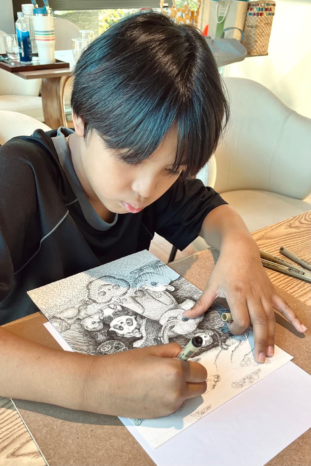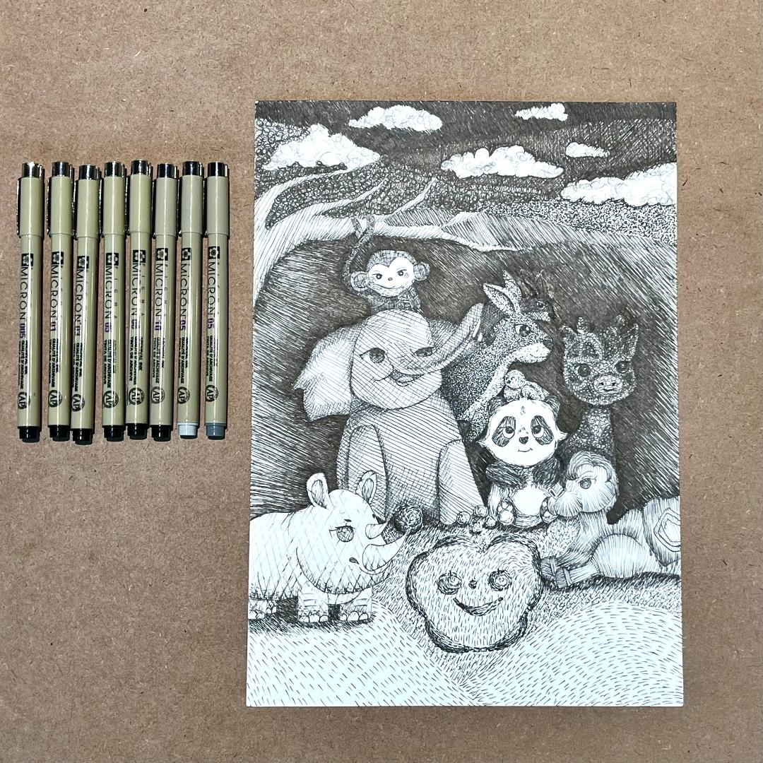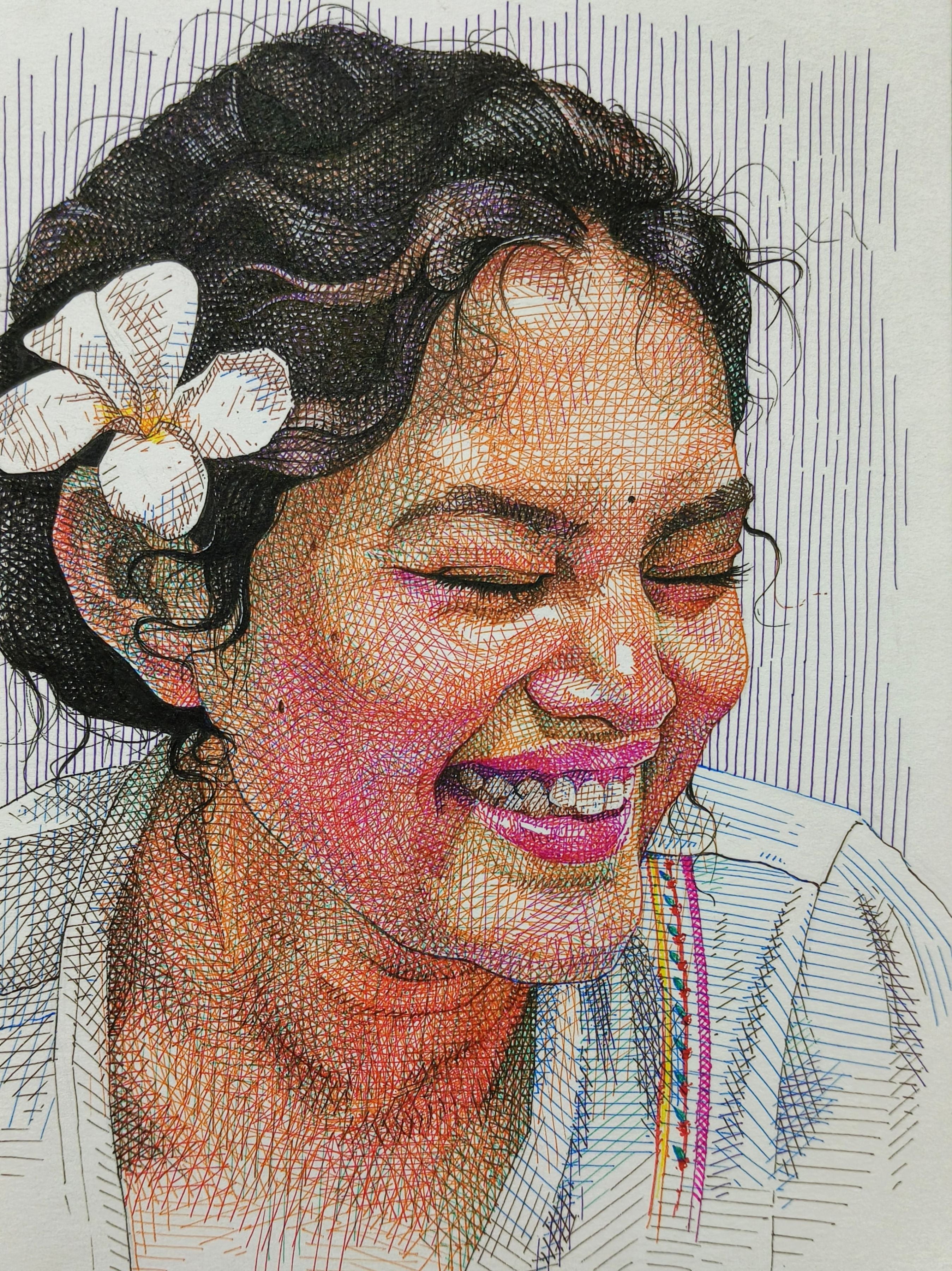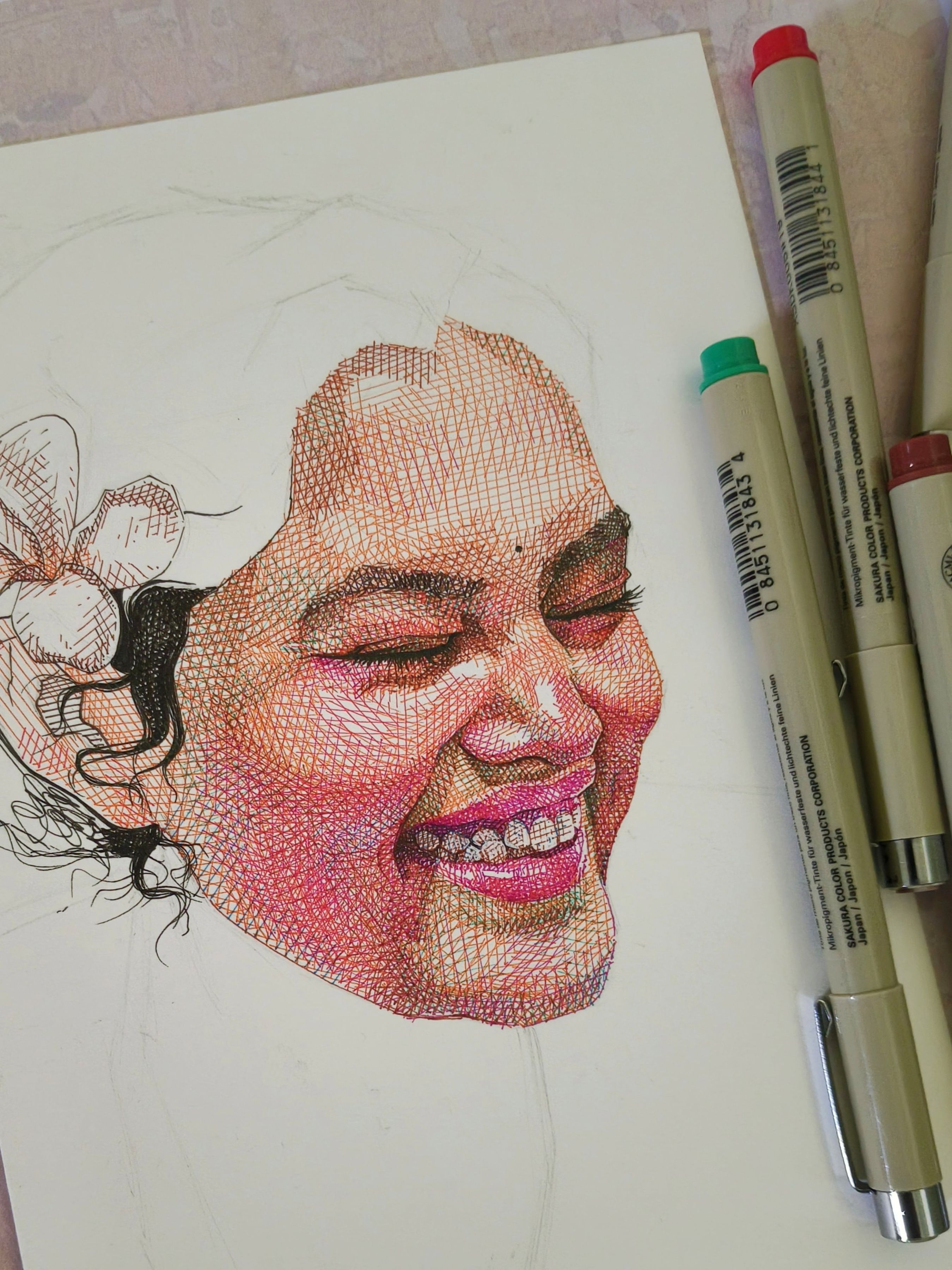 - This artwork is created using multiple layers with vibrant Sakura Micron Pens. Through the meticulous technique of cross-hatching, I aimed to capture the pure joy radiating from my subject's expression. The interplay of colors and layers highlights the emotion and depth of the piece, celebrating the versatility of Sakura pens.