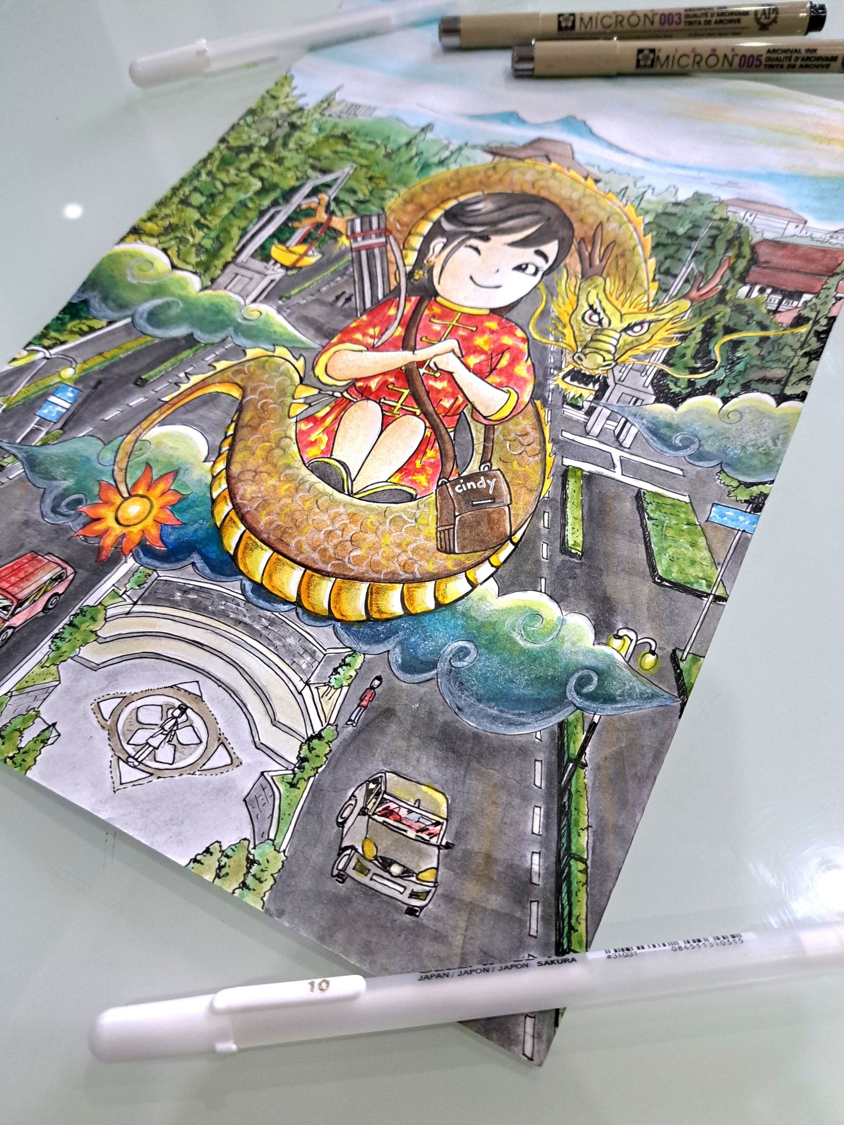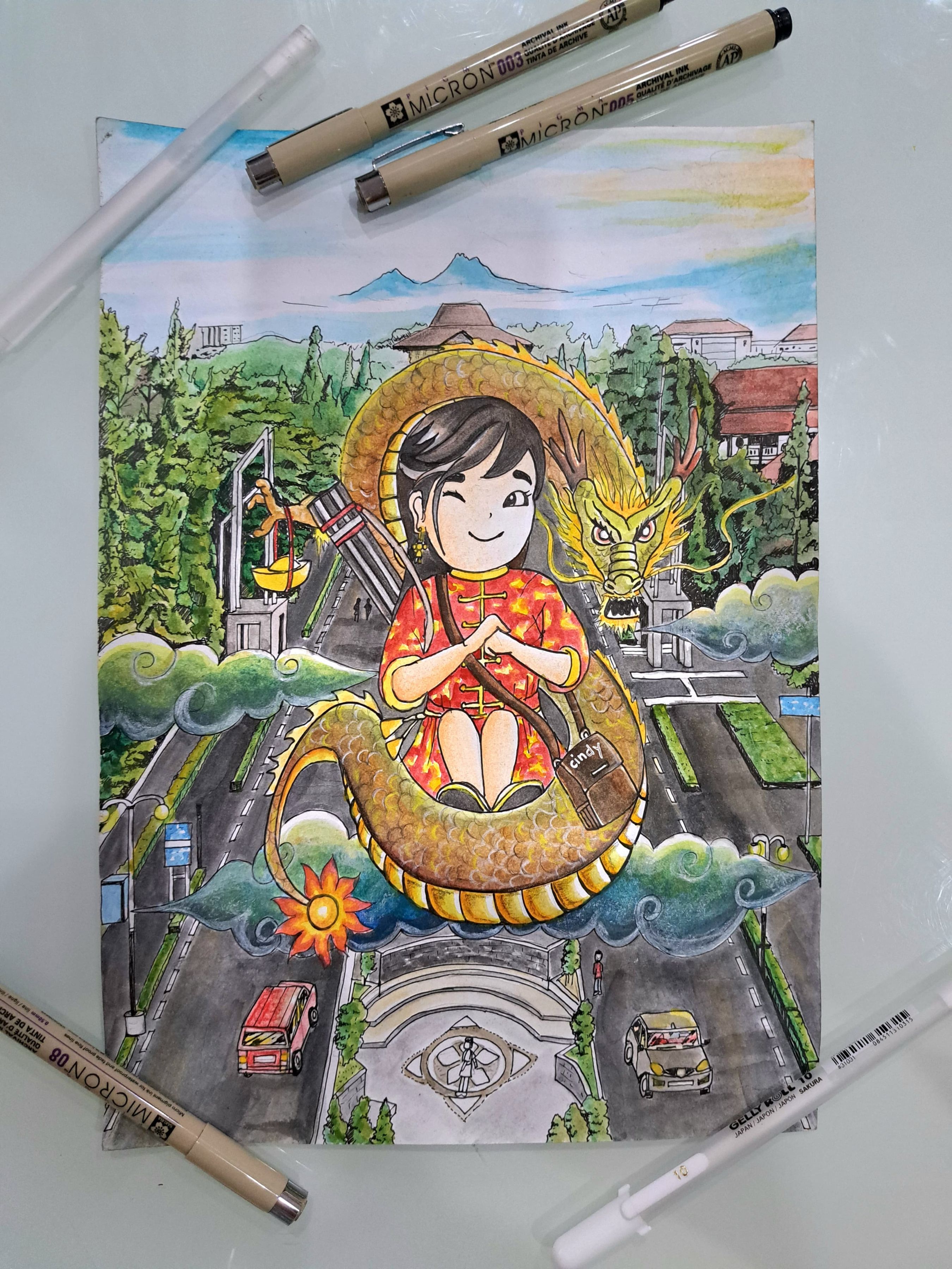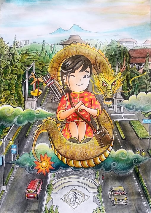 - This image tells my happiness in the year of the wooden dragon, where I was accepted to study for undergraduate degree in Architecture Engineering at Gadjah Mada University (UGM) Yogyakarta, Indonesia. A woman is seen carrying an architect's tube being escorted by a wooden dragon to the UGM campus. UGM is the best campus in Indonesia, the number 1 engineering faculty in Indonesia and number 316 in the world (according to the QS world University ranking, 2024). The background of the image is the road to the UGM Yogyakarta campus which I drew with a bird's eye perspective. May God Bless me, and success in pursuing knowledge at the Faculty of Architecture Engineering UGM Yogyakarta, Indonesia. Greetings Art, Stay Enthusiastic